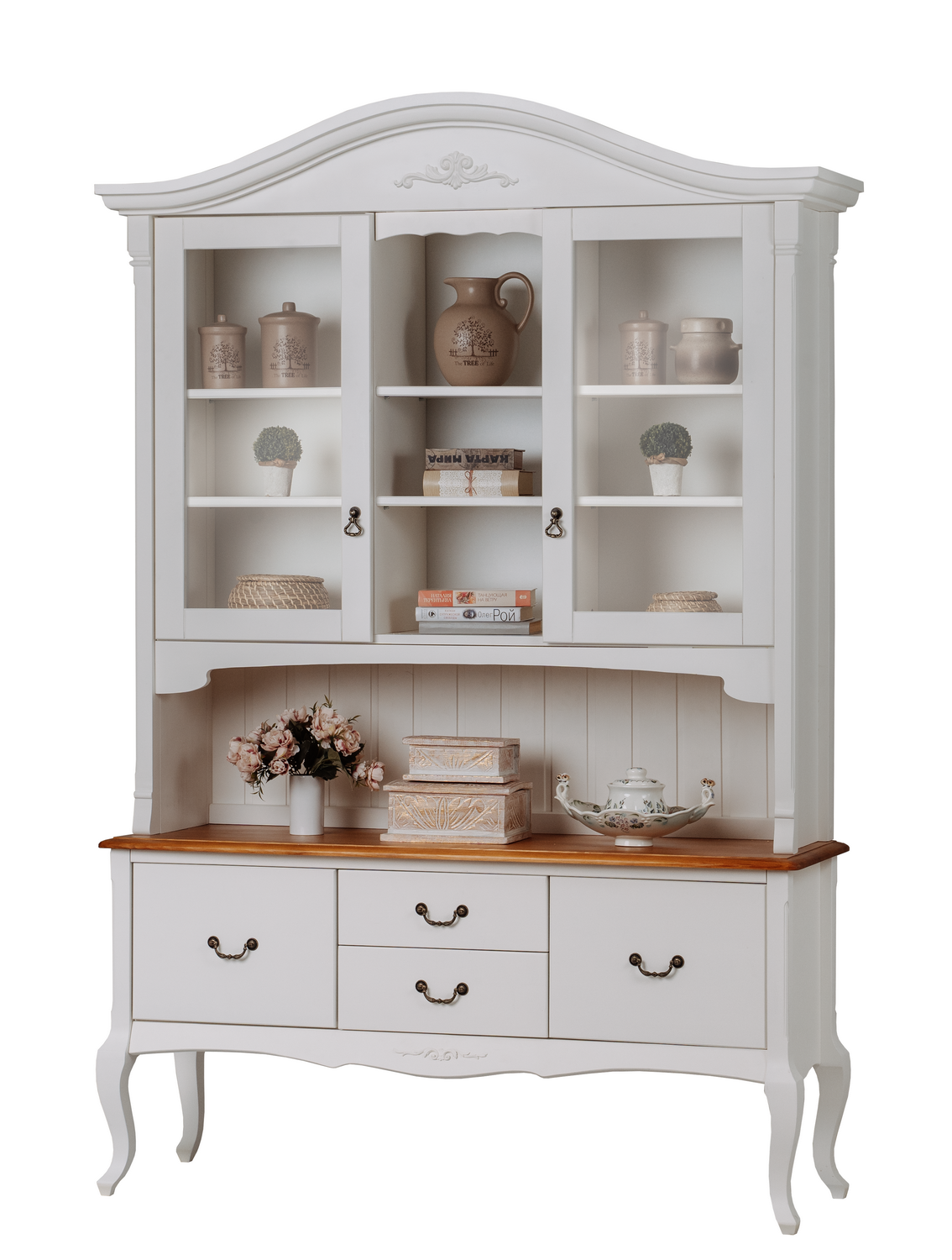 Трехстворчатый буфет «Ари-Прованс №3» с дверцами и ящиками. Изготовлен из натурального природного материала – массива сосны. Можно заменить детали из массива на детали из МДФ без сучков и текстуры дерева. Сверху два отделения с полками и дверцами, внизу четыре выдвижных ящика. Высота центральной ниши 320 мм.