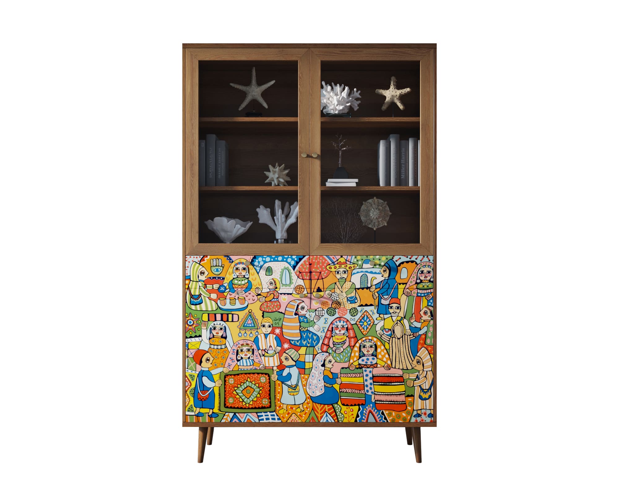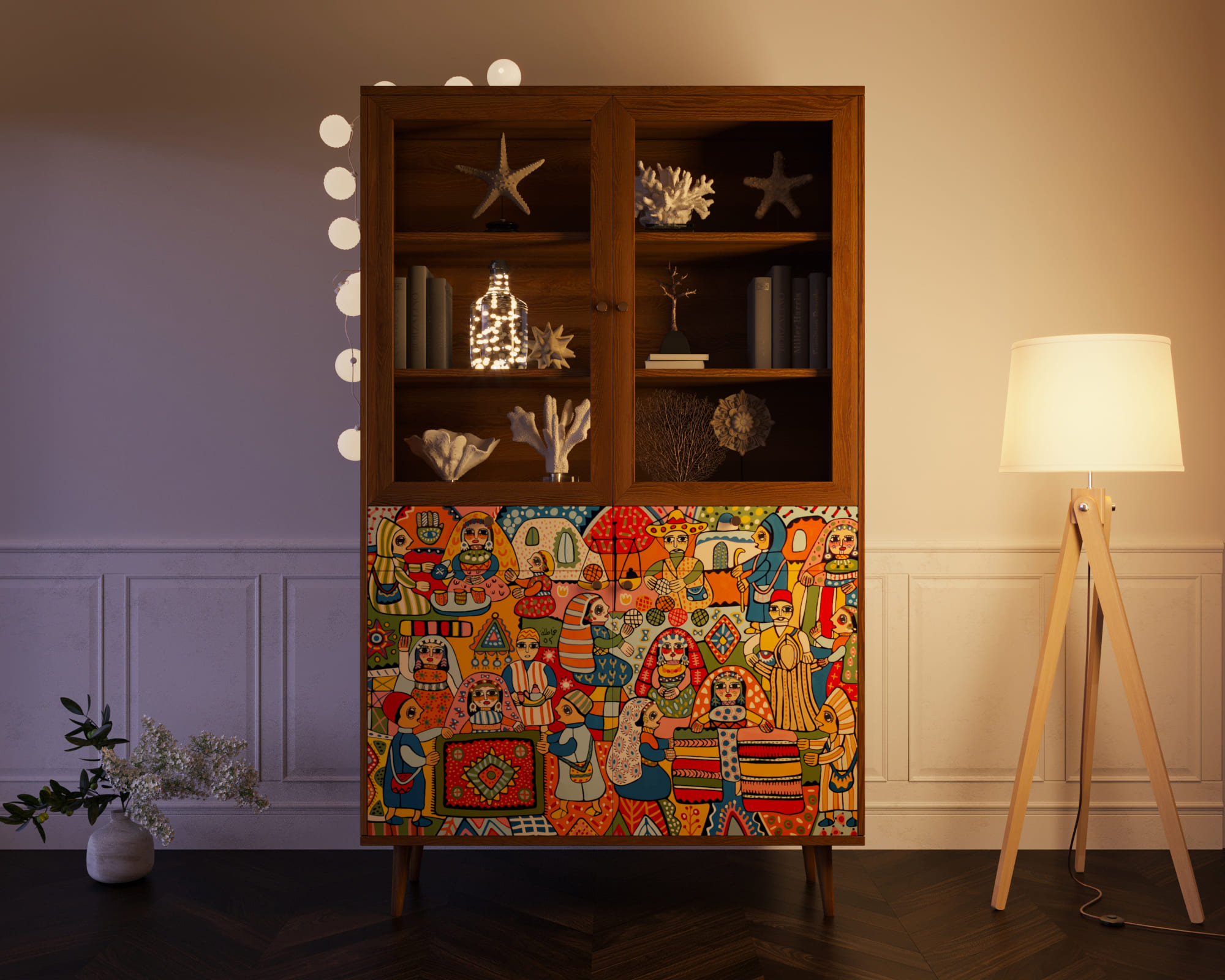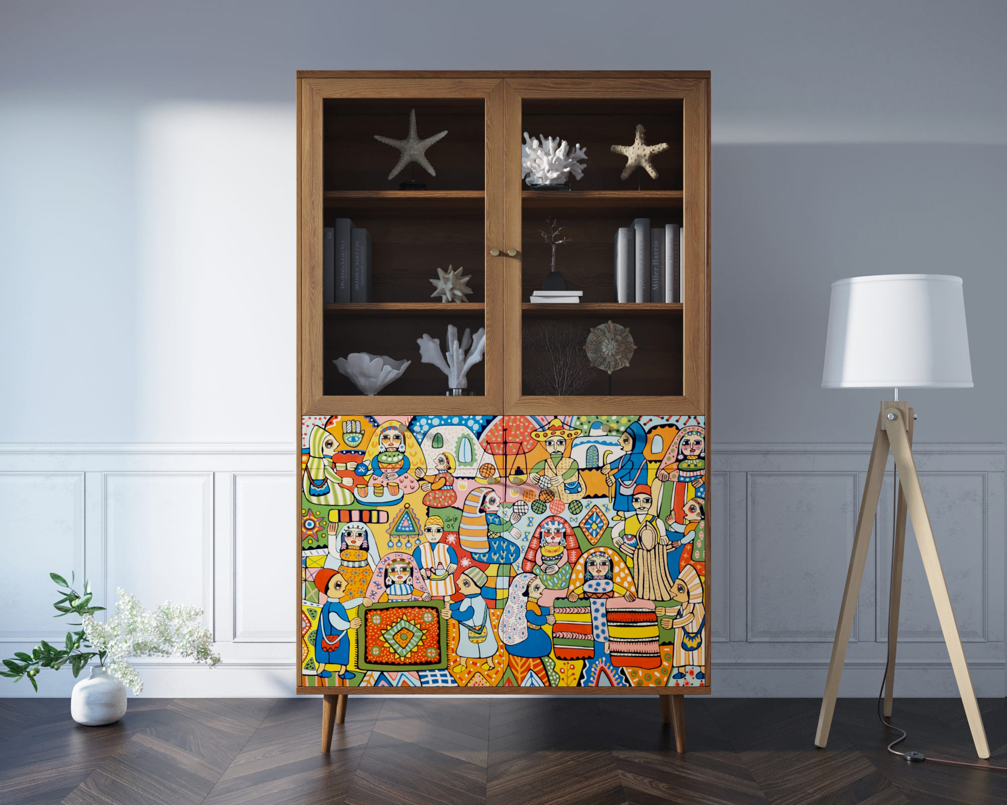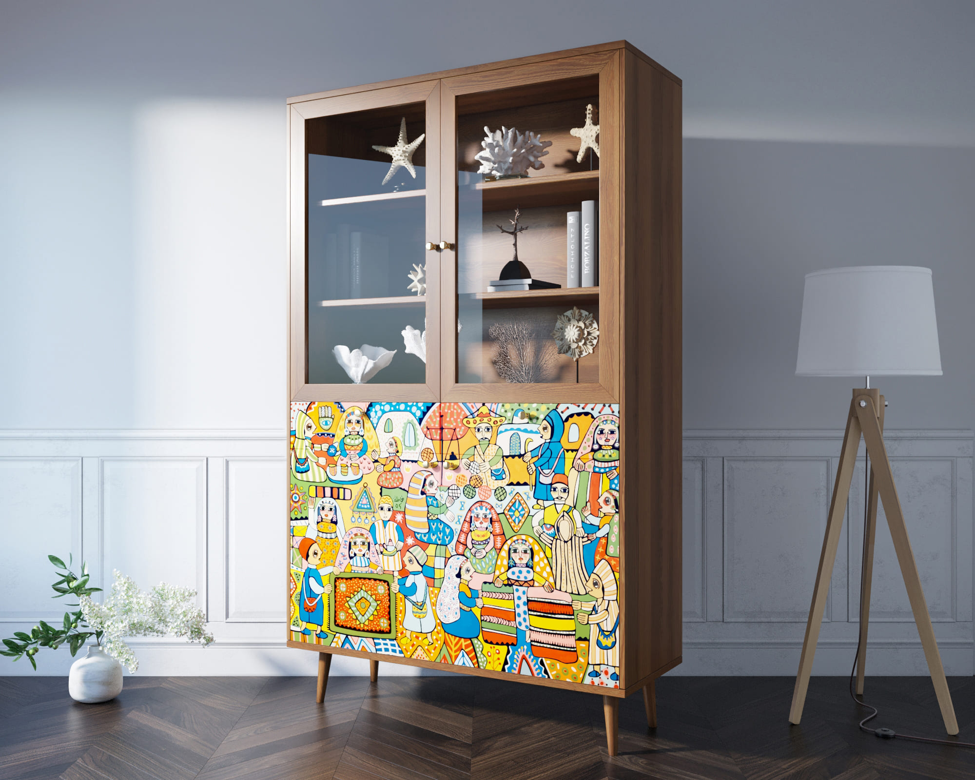 Корпус и ящики изготавливаются из ЛДСП австрийской компании "EGGER". Ножки мы делаем из массива ясеня и крепим на стальную пластину, на дверях петли с доводчиком а на ящиках шариковые направляющие. Принт на фасады наносится принтером специальными УФ - чернилами.