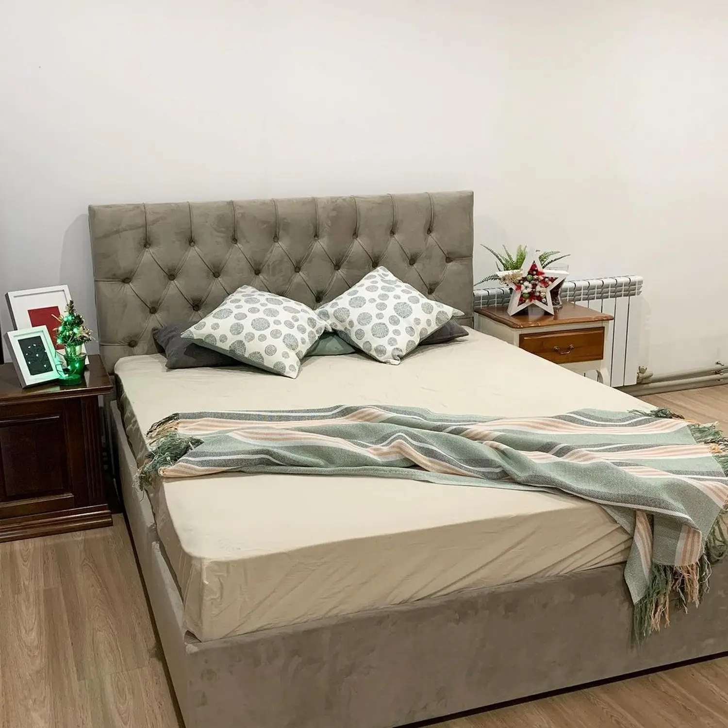 За счет мягкого изголовья кровать выглядит уютной.