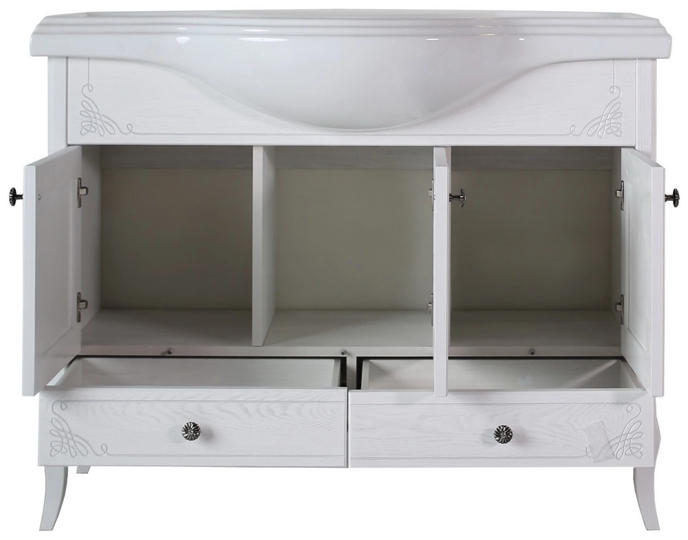 Мебель из коллекции «Салерно» для ванной комнаты – это оригинальная тумба с тремя дверцами и двумя нижними выдвижными ящиками, зеркало с полкой и двумя светильниками, раковина и пенал с двумя дверцами и ящичком для мелких предметов. Есть вариант тумбы с двумя дверцами и одним нижним ящиком. На выбор два цвета – белый и антикварный орех.