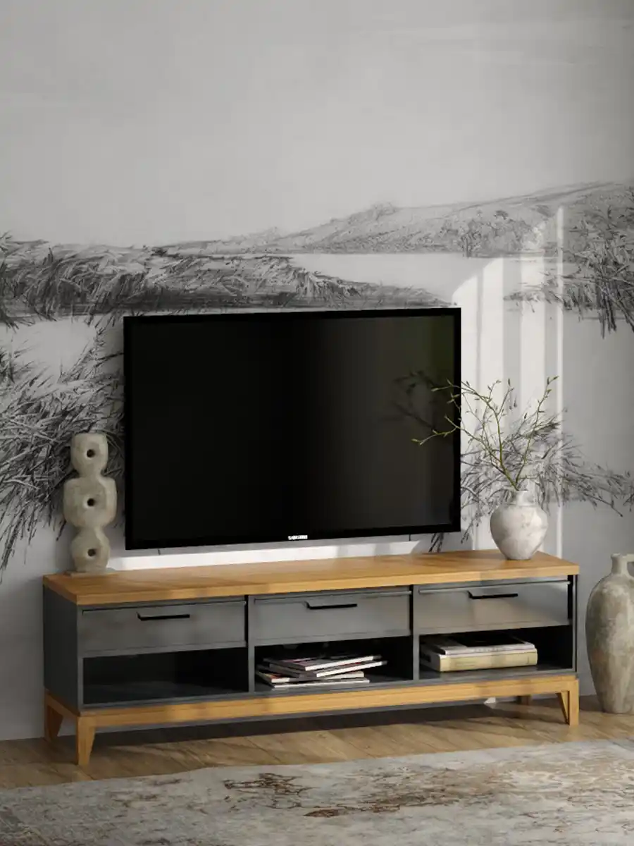 Тумба для телевизора имеет основание с высокими крепкими ножками, которые обеспечивают ей устойчивость. Кроме того, тумбу не нужно сдвигать во время уборки: под ней остается достаточно пространства, в том числе для уборки роботом-пылесосом. В задней стенке предусмотрены отверстия для вывода проводов. На ящиках чёрные профильные ручки.